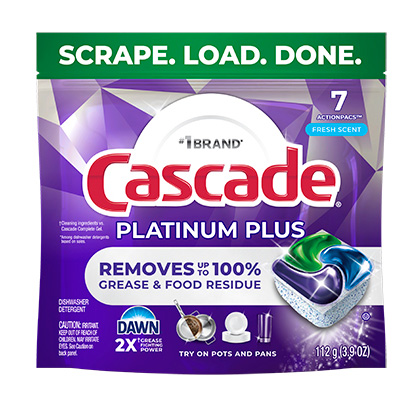 New and Improved Cascade Platinum Plus ActionPacs dishwasher detergent gives your dishes a breakthrough clean with up to 100% food residue removal. Loaded with 2X* the Dawn grease fighting power, and 2X* the tough food scrubbers, it has soaking, scrubbing, and rinsing built right in.